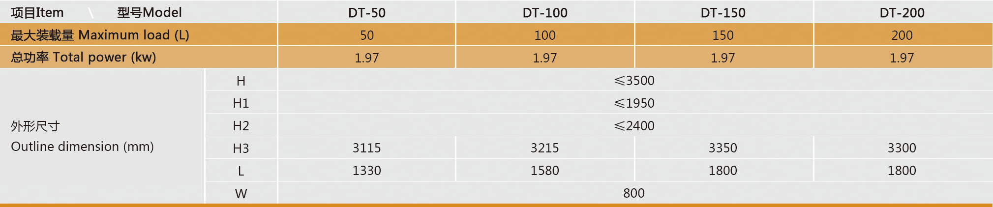 DT型提升机为移动式,整个机组安装于可移动的推车上,料桶夹持臂在提升到一 定高度后,可做任意角度的旋转,在支撑臂的上方和下方均装有限位器,可自动检测装料桶的上升与下降高度,确保送料高度的准确、安全、到位。待料斗到位 后,打开碟阀即可出料。
