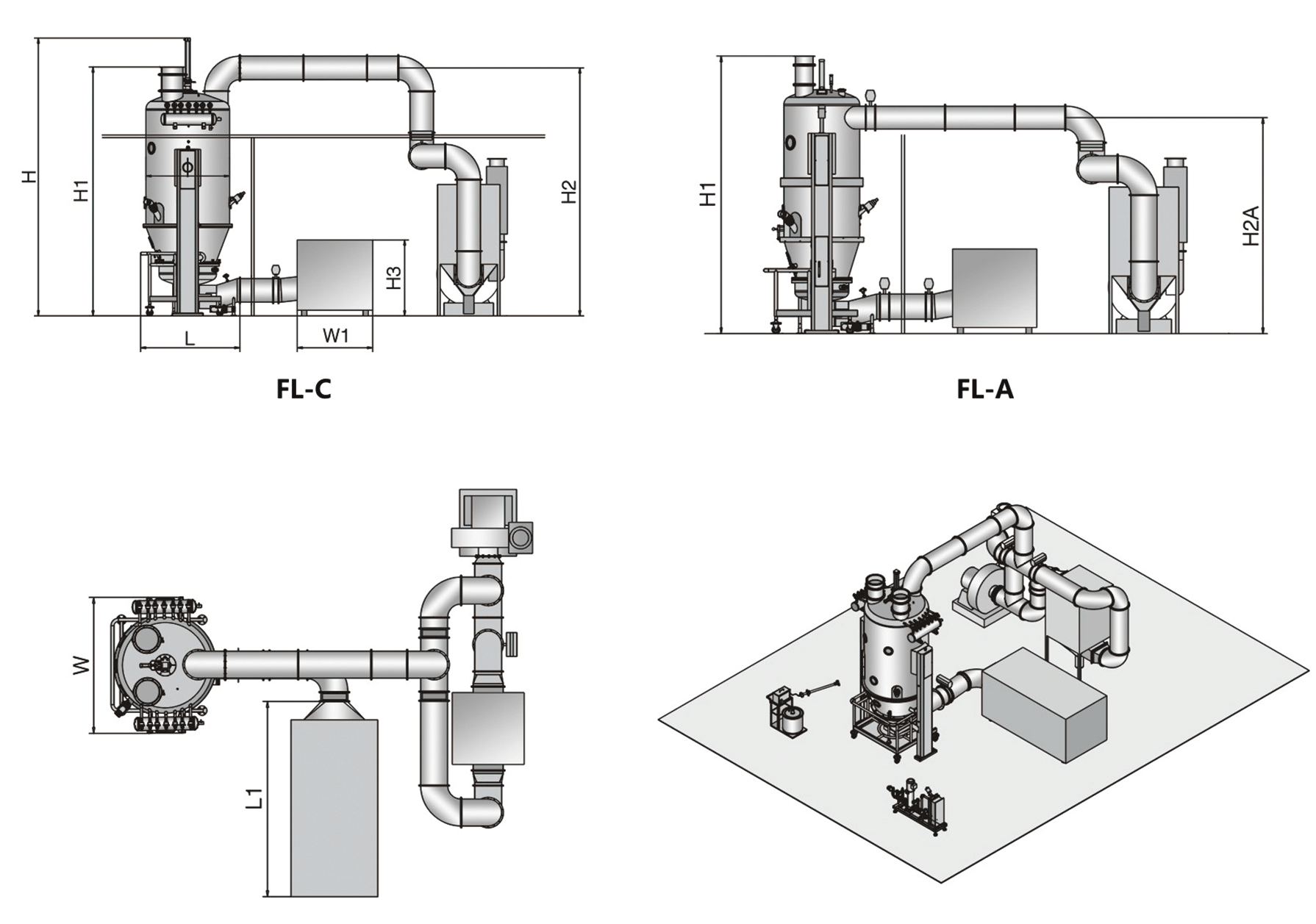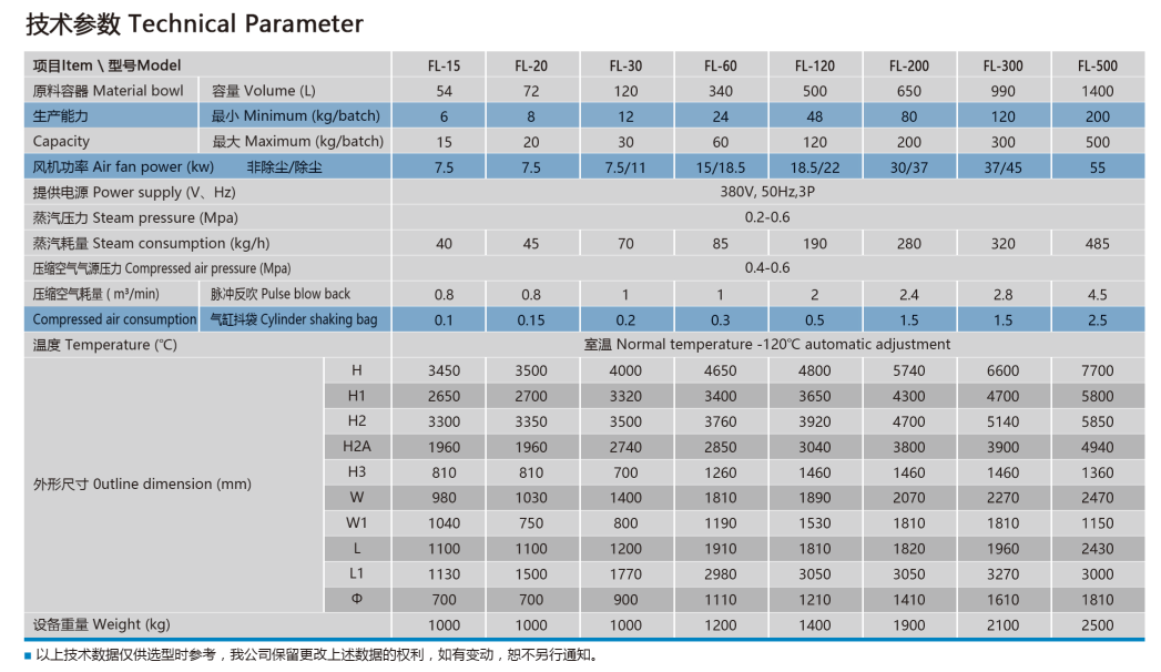 FL型沸腾干燥制粒机拥有主机、进风柜、排风柜、加热系统、供液系统、控制系统。工作时,物料由湿法制粒机进入沸腾制粒主机中,进风空气处理单元将进风空气过滤加热后进入流化床底仓,热风经料仓和气流分布板将物料吹起,形成连续的流化状态。湿颗粒在热空气的流化下逐渐干燥成为干颗粒。